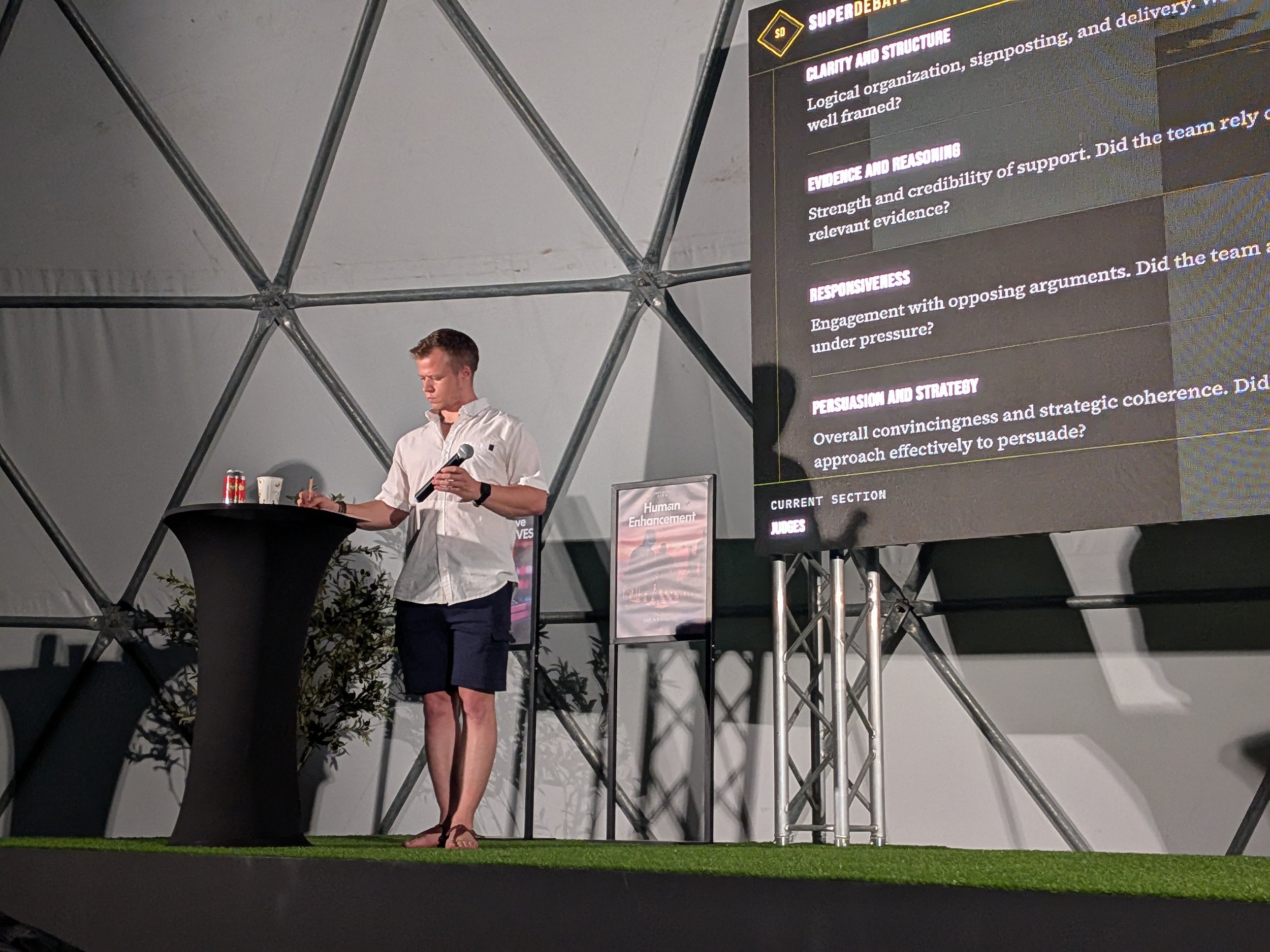 John always announced the debaters’ names and the topic at the start of each round. There were five topics covering technology, policy, and local issues: