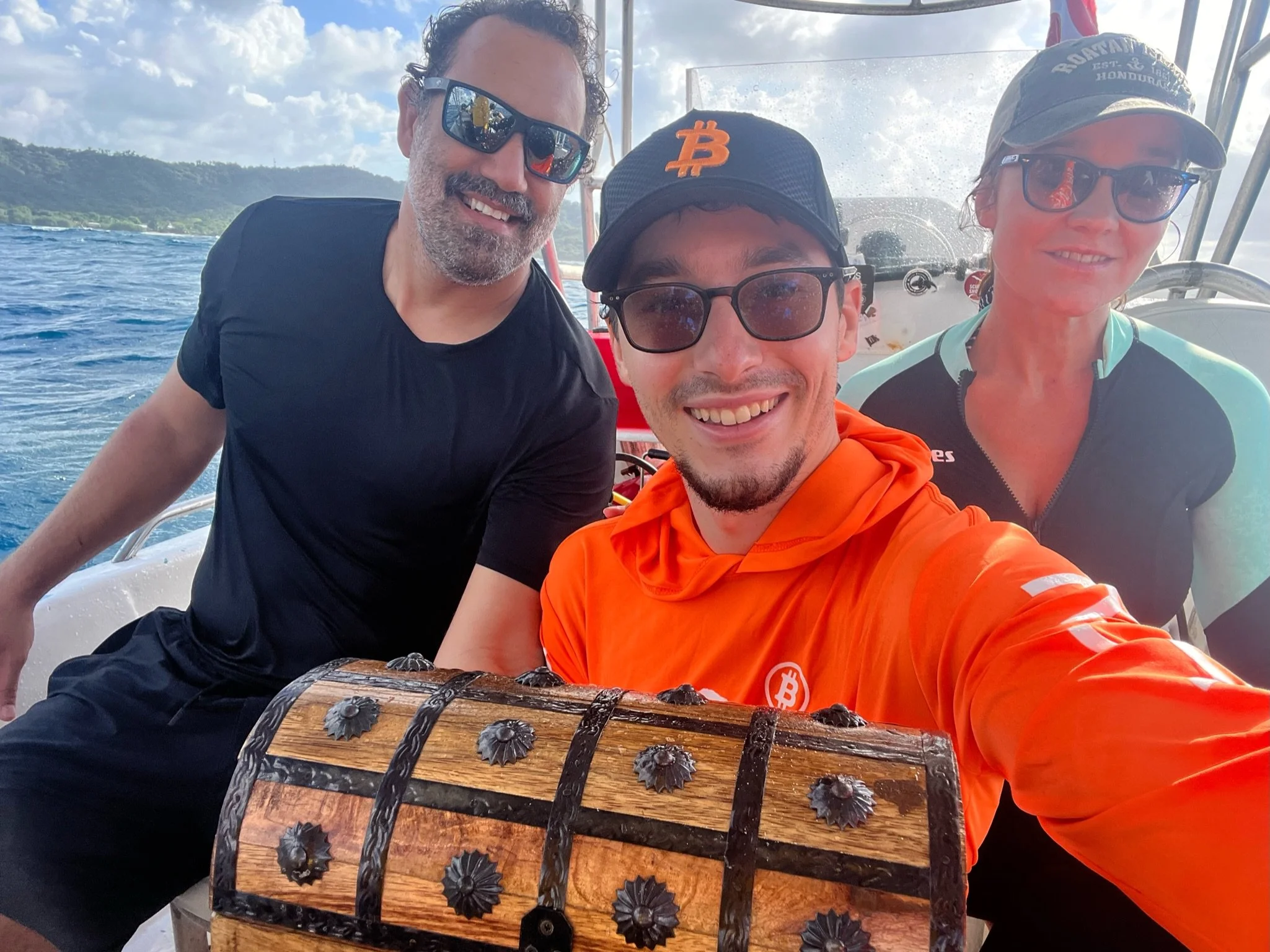 Undeterred by the warning, Dusan rented some gear and headed out to the reef with Emilio and an old map Emilio had constructed since he first learned of Satoshi Nakamoto's disappearance in 2008. Dusan dove into the crystal-clear water just off the northern shore of Roatan. As he swam towards the treasure site, Dusan saw a glimmer of what appeared to be the Bitcoin logo in the sand. The sign was made of fiberglass, and it had a treasure chest chained to it. Dusan dug out and cleared the old rusty chest and noticed there was a note attached. The note read, "use this private key to unlock this chest, and be sure to HODL your new 10,000 Bitcoins".